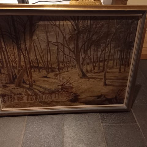 Maleri i en gylden ramme med skov og vandmotiv.