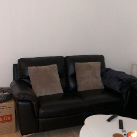 Sofaen har et blødt, polstret udseende med brede armlæn. Den er lavet af læder og har en mørk farve.,Afhentes i:,Røde Kors Tuborgvej / København NV (101),Bemærk at mail, chat og beskeder ikke besvares, og varen skal købes på knappen "Gå til varen"