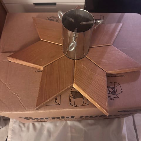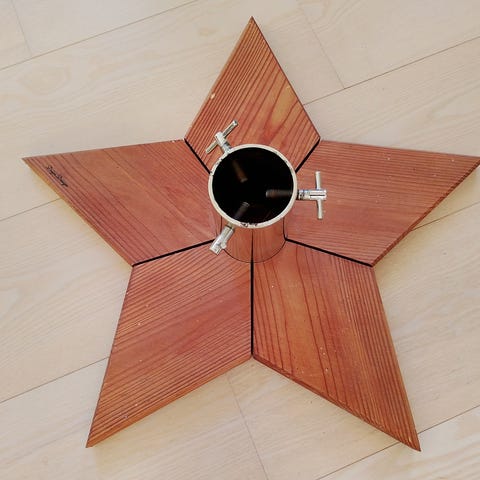 8 stjernet juletræs fod i træ og messing. 48 x48 cm og 15 cm høj. Dia. på hul 7 cm.