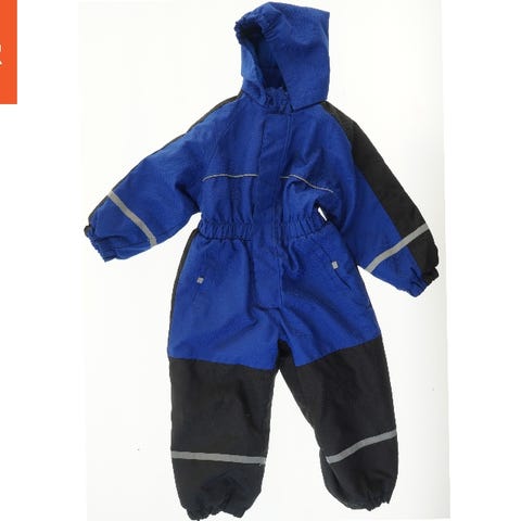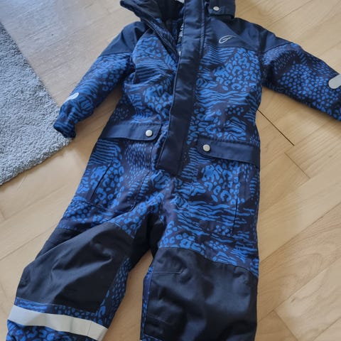 En blå børneheldragt med mønster og en hætte. Dragten har en lynlås foran og elastiske kanter ved håndled og ankler. Der er også refleksstriber på ærmer og ben for ekstra synlighed. Bagpå er dragten sort på den nederste del. Den er velegnet til koldt vejr.