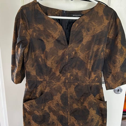 Kjolen har lange ærmer, foer og et mønstret design. Materialet fremstår let og er meget behagelig at have på.