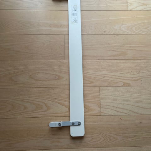 IKEA børnemøbel sikkerhedsliste i hvid farve. Designet til at forbedre sikkerheden ved børnemøbler ved at forhindre utilsigtet åbning eller lukning. Fremstillet af holdbare materialer med metalbeslag for fastgørelse. Passer til forskellige typer børnesenge