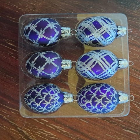 Set of 4 egg-shaped Christmas ornaments in black with silver glitter patterns.