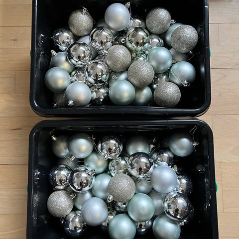 Sæt med 4 ægformede julekugler i sort med sølvglitter mønstre.