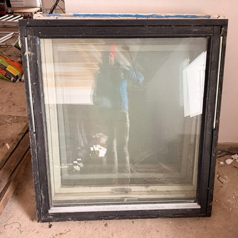 Vindue lavet af glas og træ. Produktets størrelse og yderligere specifikationer er ikke angivet.