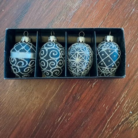 Set of 6 egg-shaped Christmas ornaments in purple with silver glitter patterns.
