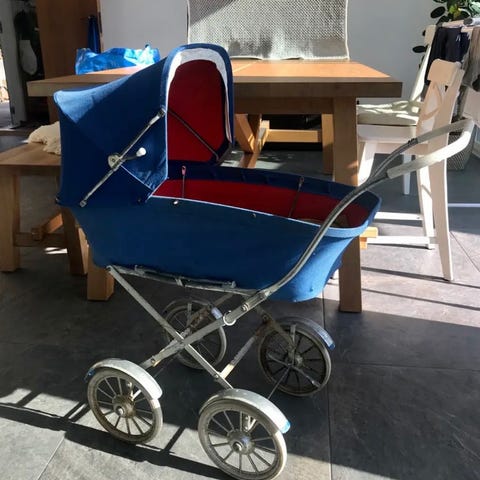 Lav børnevenlig højde. Meget rummelig - passer store naturtro babydukker. Robust og særdeles charmerende trods patina og brugsspor. Har været brugt som regi i butik samt indendørs til pigeleg, men kan fint køre udendørs. Står pt hensat i skur.