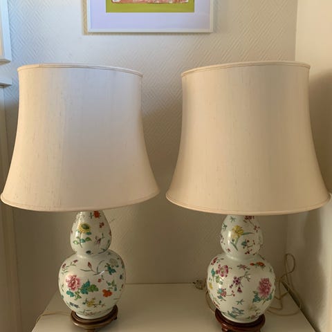Bordlampe med blomstermotiv og tilhørende vase
