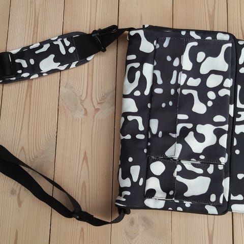 Pusletaske i mørke blå farve. Passer perfekt til at hænge på barnevognen. Er indbygget med underlag som nemt kan tages af og på. Der ses en plet som vist på billedet, fremstår ellers i flot stand.