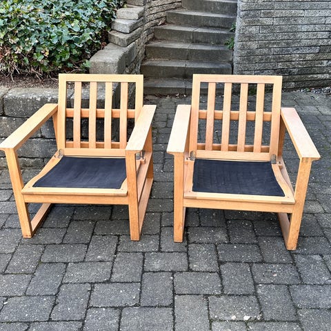 Stolene er er i meget fin stand. 60 år gamle. Slebet for et par år og har fået et tyndt lag mat hvidlak og nye gjorder. Hynderne er i fin stand. Det grå betræk er i meget fin stand. Det røde betræk er lidt falmet.