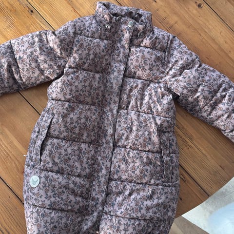 Wheat Pige Vinterjakke i størrelse 140. Jakken er lyserød og designet til børn. Den er lavet til at holde barnet varmt i vintermånederne med en lang pasform og en hætte.