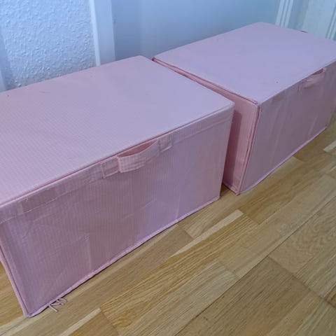 IKEA opbevaringskasser til børn med hjerteprint. Kasserne er firkantede og har et mønster med små hjerter i rosa farve. Indvendigt er kasserne lysegrå. Materialet er pap eller lignende, egnet til opbevaring af legetøj eller småting. Kasserne er designet til børneværelser og kan bruges til organisering.