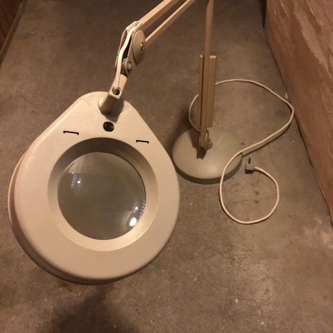 Luplampe med bordklemme. Virker perfekt. Glasset er uden ridser og det er nemt at skifte pære, da den fungere med alm pærefatning.