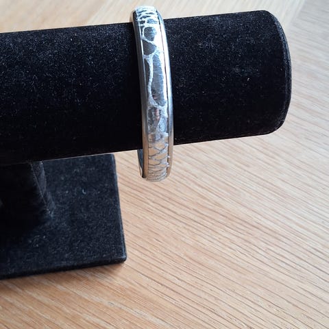 2 stk. Sølvfarvede armbånd med blomstermønster på overfladen.