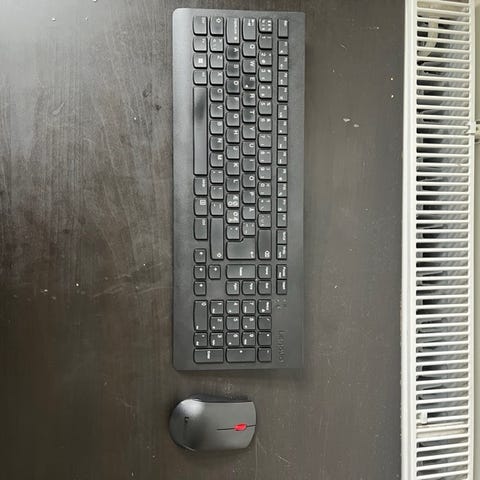 Lenovo tastatur og mus sæt med trådløs forbindelse. Tastaturet er sort med fuldt numerisk tastatur og standard layout. Musen er sort med en rød markørknap. Sættet er designet til generel brug med fokus på funktionalitet og komfort.