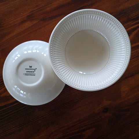 Windermere, Enoch wedgewood skålesæt med 6 små skåle og låg i pæn stand, forstået således at der ikke er nogen skår i! En af skålene bærer præg af brug/misfarvning.