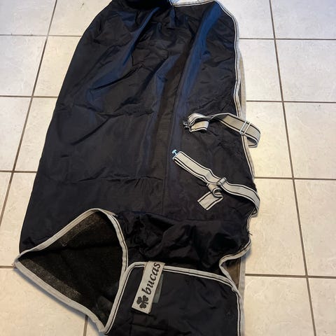 Det blå er str. 155 og er nyvasket om imprægneret. Dette er ikke brugt særligt meget, men de fleste af D-ringene til bagbensstopperne er faldet af, så hvis man vil bruge disse skal der sys nye på. Ellers intakt