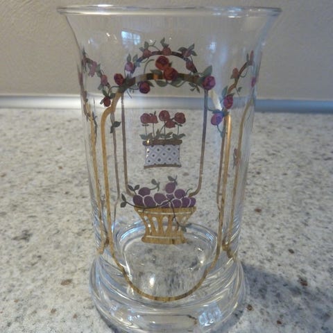 Højden er 19 cm, bredden er 9 cm og dybden er 7 cm. Flasken er med messingprop.
