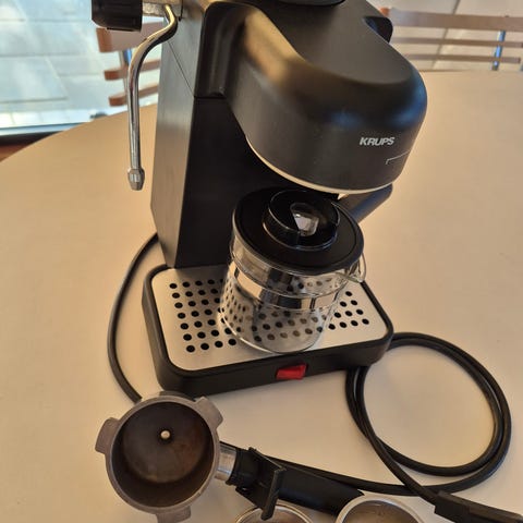 Krups Espressomaskine i sort farve. Maskinen har en manuel dampstav til mælkeskumning og en drypbakke. Velegnet til tilberedning af espresso og andre kaffedrikke.