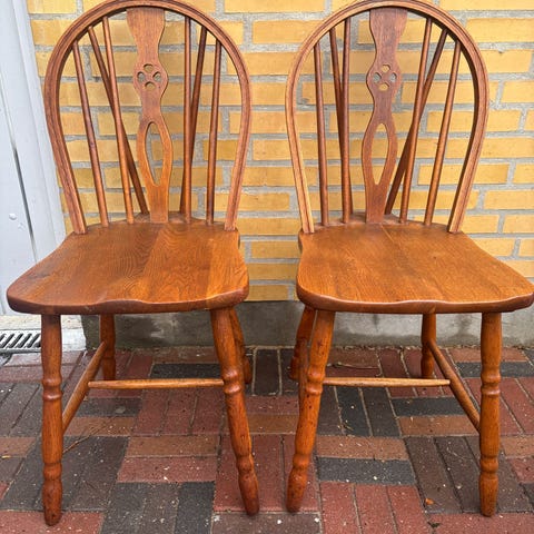 8 Antikke Krostole – Assorterede vintage pindestole Windsor stole i mørkbejset Træ med charmerende gammelt udtryk.