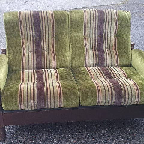 Sofa, 2 pers., retro, antik sofa fra omkring år 1900. Sofaen er to-personers, men siderne kan slås ned, så man kan sidde enten tre eller fire personer i den, og den er dermed også en sovesofa. Sæderne kan vendes, så man kan sidde på et ensfarvet sæde eller på et mønstret.