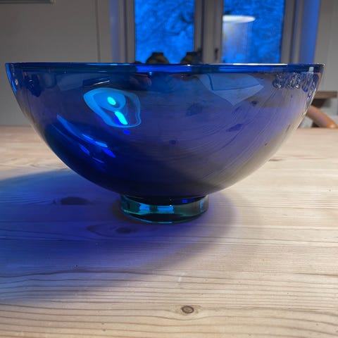 Skål af mundblæst blåt glas og klar grøn fod fra serien Harlekin. Har alm brugsspor