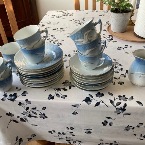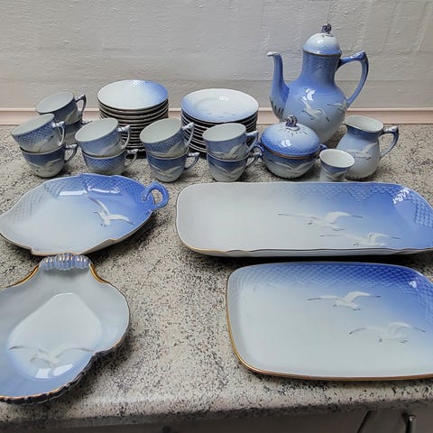 13 personers kaffestel med sukkerskål med låg flødekande der medfølger 3 fade chokoladekande og tre askebægre. Der er ingen skår