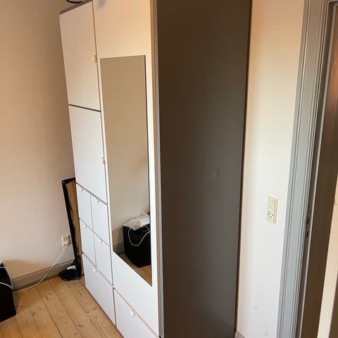Sælges ikke som samlet skab i IKEA længere. De tætteste man kommer på er en samling af to skabe som kan ses på de sidste billeder. Den eneste forskel er at dette er i en fastbygget ramme og ikke blot er skubbet sammen.