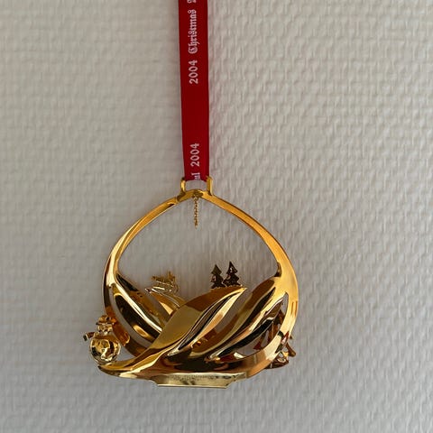 Georg Jensen 1998 Juleophæng Jul Ornament i metal med guldfarvet finish. Dekorationen forestiller en fugl på en gren og er designet til brug som julepynt. Leveres i original æske med bånd til ophængning.