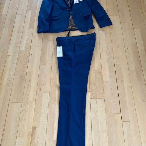 Superflot og helt klassisk mørkeblåt jakkesæt / habit fra J. Lindeberg. Str 48, hvilket svarer nogenlunde til str M. 100% virgin wool. Brugt to gange. Som nyt / helt perfekt stand.
