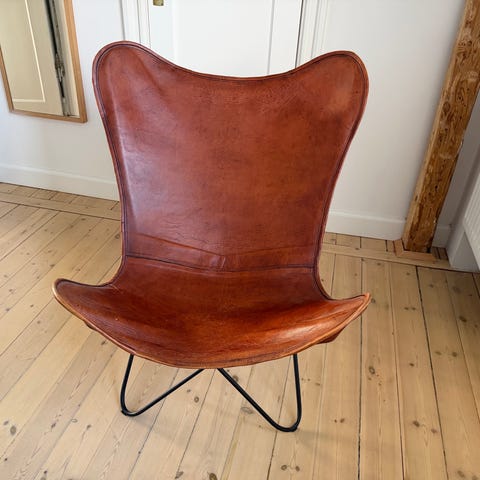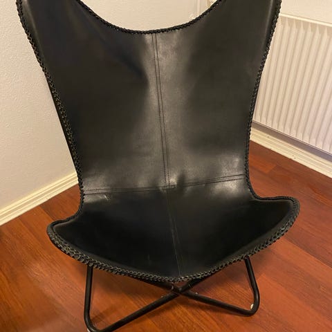 IKEA Kurt Nørregaard Butterfly stol med sort læder og metalstel. Stolen har et karakteristisk design med buede linjer og et let stel, der giver stabilitet. Velegnet til brug som siddeplads i stuer, kontorer eller opholdsområder.