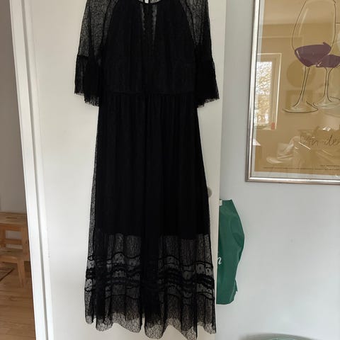 Sort fest- og cocktailkjole i størrelse XS til kvinder. Kjolen er lang og med lange ærmer og er fremstillet i et materiale med glitrende palietter, der giver et elegant udseende. Velegnet til formelle begivenheder og fester. Nypris kr. 2.500,-