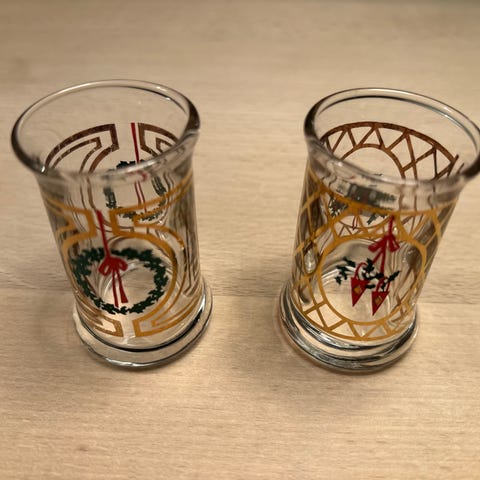 Holmegaard Glas Sæt med forskellige dekorative mønstre i glasmateriale. Sættet indeholder flere små glas med unikke designs, herunder guld- og hvidmalede detaljer. Velegnet til servering af drikkevarer. Dram og snaps fx 🌲🤶