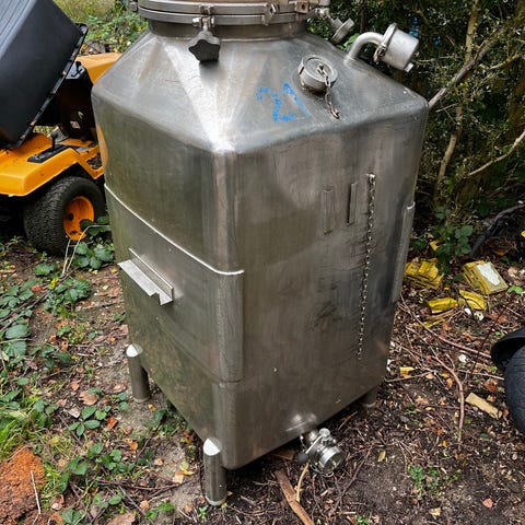 Holder op til ca. 300 L. Har haft tilsluttet køle/varmeanlæg, men det følger ikke med. Rør til køl og/eller varme findes stadigvæk på sin plads i kappen. I meget ren og flot stand. Omrører har fungeret, men motoren har set bedre dage. Stort ‘man hole’ i top (pakning fuldkommen ny) som er praktisk ifht rengøring. Udstyret med et STORT (Ø 100 mm) rør til aftapning. Brugt til fermentering. Egner sig til hvis du skal producere f.eks. øl, kombucha, eddike eller lignende i halvstor skala. Vi har brugt det til test, men har købt større tanke til nuværende produktion, så derfor skal vi ikke bruge tanken længere. Kom evt. med et bud.
