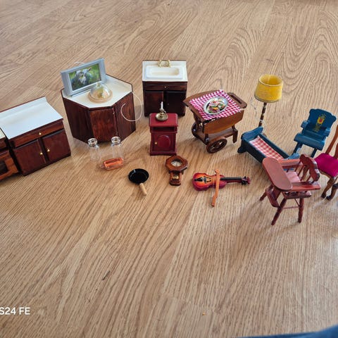 Dukkehus. Længde 50 cm, højde 32 cm og bredde 18 cm (bredde når det er slået ud 36 cm. Der medfølger ca. 20 stk. møbler/tilbehør.