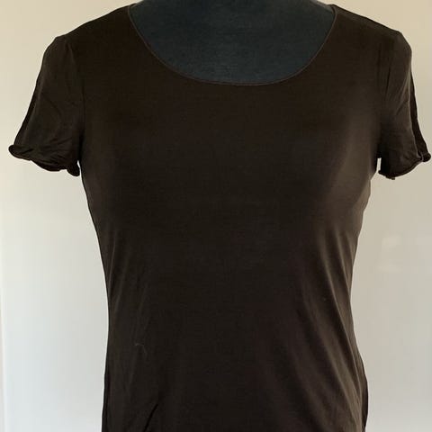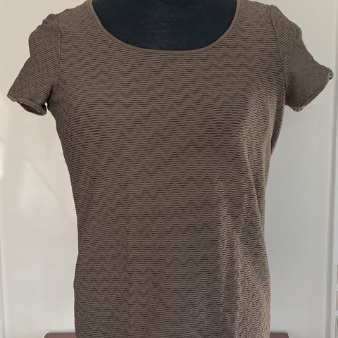 Armani bluse i stribet lysegrå og mørkegrå. Blusen er med et længere 3/4 ærme og rund halsudskæring se billede 1 og med detalje i venstre side se billede 2. Blusen er i størrelse 44-46 eller på italiensk 52, som der står i blusen. Brystmålet er cirka 108 cm og længden cirka 54 cm. Blusen er fremstillet af 73% viskose, 23% polyester og 4% akryl.