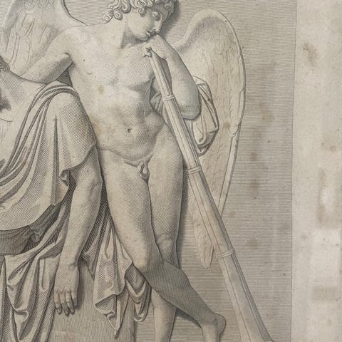 "Natten": Viser den personificerede nat som en frit svævende, bevinget kvinde. Hun bærer to sovende børn (Søvnen og Døden) i sine arme. Hendes hår er flettet med valmuer, kendt for deres søvndyssende egenskaber, og en ugle flyver med som nattens dyr.