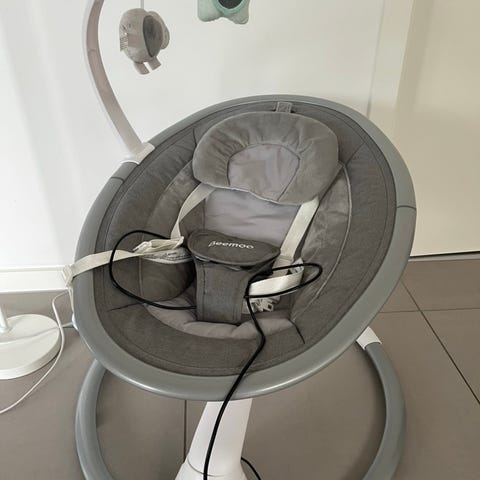 Skråstol fra Beemoo. Perfekt når du vil have hænderne frie til andet og samtidig lade dit barn hvile eller lege trygt.