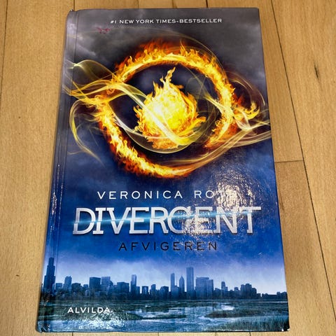 Veronica Roth Divergent bog med hårdt omslag. Bogen er på dansk og indeholder science fiction og dystopisk fiktion. Velegnet til læsere interesseret i unge voksne litteratur.