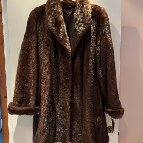 Fantastisk smuk og lækker minkjakke / minkpels i brun hunmink syet af Giacomo Caiezza. Meget smuk brun mink. Brugt få gange. Str 36.