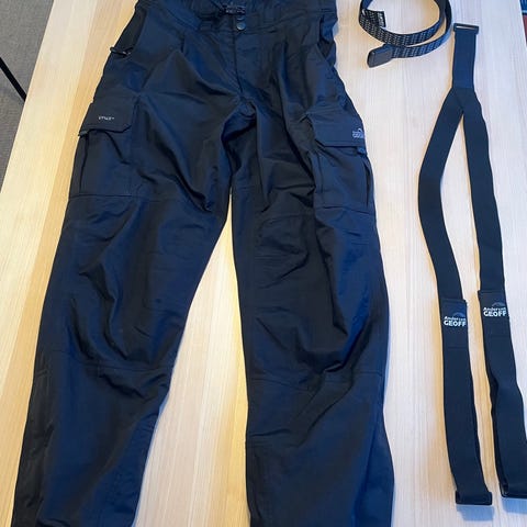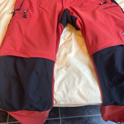 Blå udebukse fra Stormberg str. 152. Vind -vannavvisende. Kan justeres og strammes i livet, samt strammes nederst på benet.