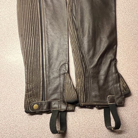 Horze Læder Chaps i sort farve. Chaps er fremstillet af læder og har lynlås på siden samt elastisk strop under foden for fastgørelse. Passer til brug som beskyttelse ved ridning eller lignende aktiviteter.