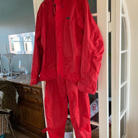 Rødt regnsæt, med et lille hul i jakkens foer - se foto.