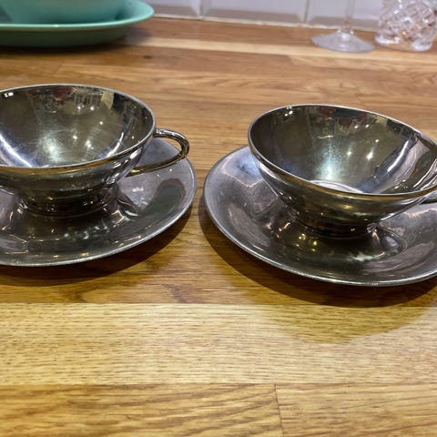 2 stk kaffekopper og underkopper i porcelæn. Kopperne er hvide med små blomsterdekorationer og grøn Tivoli-logo. Sættet indeholder to kopper med tilhørende underkopper. Porcelænet har en guldkant rundt om kanten. Velegnet til servering af the & kaffe.