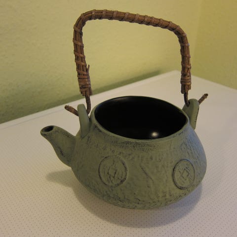 I sart grøn og gul farve med lidt motiver af teposer og citronskiver fordelt bag på kanden.