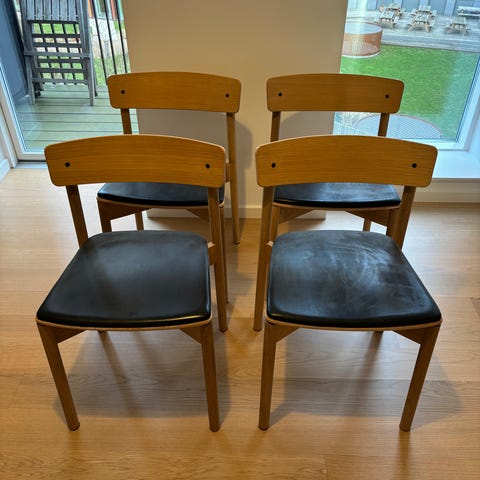 Fine spisebordsstole fra danske TAKT. Modellen er Cross, og udført i sortmalet træ med sæde af gråsort læder. Rigtig god siddekomfort. Fejler intet og i rigtig god stand.