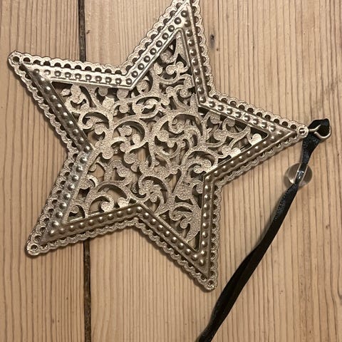 Stjerne lavet i tyndt træ med snor i så den kan hænge.