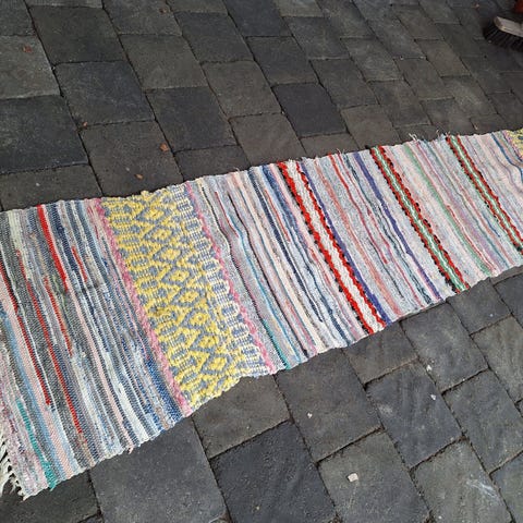 Smukt kludetæppe med et stribet mønster i forskellige farver. Måler ca. 71 cm x 210 cm