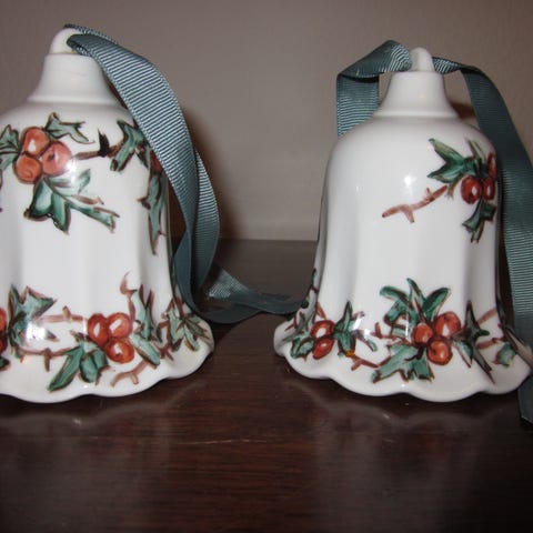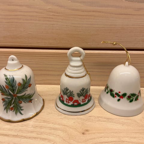 2 hvide juleklokker med kristtjørn og en glas klokke med en bamse som knebel og en lille kvist på toppen.