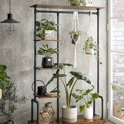 - Robust stålramme og hylder i spånplade (rustik brun/sort)